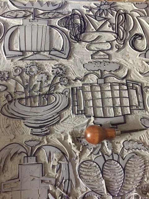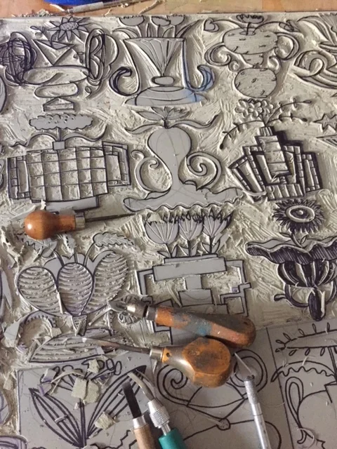 The other print I am working on is a one-color vase study and it is almost completed. The images included in this blog are definitely works in progress. I shot this image early in the morning with the block covered with tools and crumbs. This print should be completed soon.