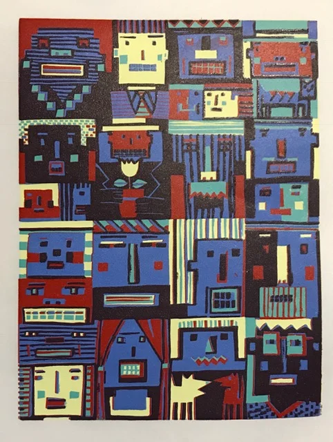 Latest version of the next Blockheads. I am getting the registration I want in this print but I notice that some of the earlier prints in the series were more easily read and understood with less activity. I am beginning a new print in oil ink and will see if I can can color/accuracy of registration/ less activity to come together. Some similar information: edition of @ twelve and 12" x 16".